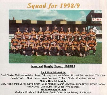 Sven Cronk was appointed captain for season 1998/9 and Tony Brown was appointed Chief Executive and would figure dramatically in the coming seasons. Internationals Ian Gough and Jan Machacek left. Gough went to Pontypridd as he expected Newport to be relegated and Machacek to Sale. However with each Premier side receiving £300,000 from the WRU they could at least buy some players. Newport bought Brad Clark a flanker from Wellington NZ and Matt Cardey, a full back / wing with Welsh grandparents from North Harbour, NZ. Other players to join included prop Ceri Jones, son of former Newport and Wales B lock Lyn, Welsh Rugby League international wing Jason Critchley (Castleford RL) and Canadian international centre Kyle Nichol. What was to prove to be an excellent signing was back-row / lock Joe Powell who was to give sterling service to the club and another good signing was NZ born scrum half Steve Moore. Future Welsh international back-row Alix Popham made his debut as did former Welsh international back rows Stuart Roy and Andy Gibbs (Newbridge / Llanelli). Another newcpmer was speedy wing Alan Harris (Swansea).