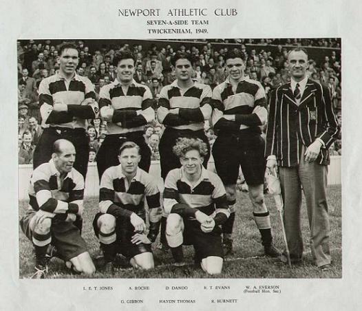 Rowland, in spite of missing many games, was still top try scorer with 21. He also managed 4 conversions. Newport had star half-backs in Haydn Thomas and Roy Burnett with “Twinkle toes” starting to really show his class and skill and benefiting from a super service from Thomas. Wings Graham Ross, Deryck Jones missed games due to injury and Ken Jones was at Loughborough and also played few games. Full-back Gerry Gibbons joined from Newbridge and played well late in the season. Backs Malcolm Thomas had joined the Royal Navy and Ken Spray was tied up at Cambridge University. A great loss was outside-half Jack Evans who turned professional with Hunslet RL after only playing the first 3 games. He eventually played for Great Britain RL. That great servant Alf Panting played 12 games filling in at full-back centre and wing.