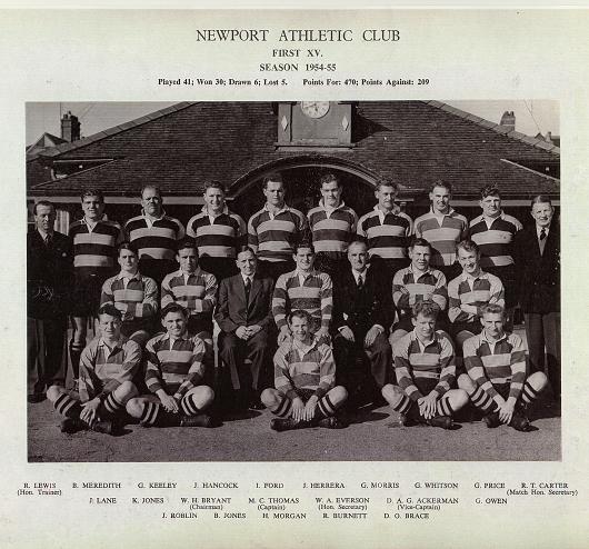 The chosen club captain Malcolm Thomas broke his leg in a club trial and the always dependable Doug Ackerman took over the role until Dec 18th 1954 when Thomas returned at the Harlequins. However Thomas fully supported the team from the sidelines while Ackerman did his duty on the field. When Thomas returned he fully recaptured his old form and the rest seemed to have done him much good. He returned having seen his team lose just 4 games of the 18 played so far. These were all away defeats – to Neath, Lansdowne, Llanelly and Cardiff.