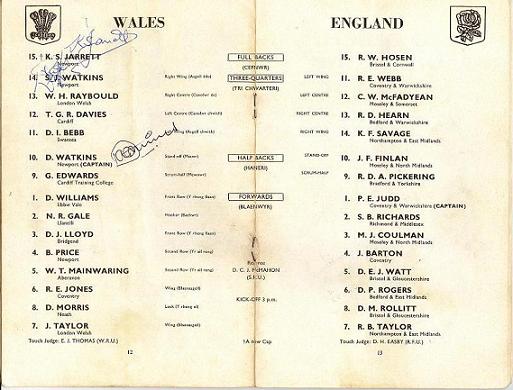 Wales won the wooden spoon but were saved a whitewash by Keith Jarrett’s remarkable debut at full-back vs England in the last match of the season. The week before he had played vs Newbridge in that position at the request of the Welsh Selectors but he was so out of place that captain David Watkins switched him back to centre at HT. Keith scored a then record 19 pts from 1t, 5c and 2p and the only kick he missed rebounded from an upright. Great credit has to go to club-mates David Watkins and Stuart Watkins who coached him and looked after him during the match. Also in that game was Brian Price who was vice-captain with David Watkins captain. David had been restored vs France in place of Barry John who had been on the losing side for both of his Wales appearances.