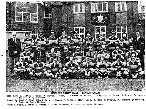 British Lions scrum-half Brynmor Williams transfered from Cardiff where he had been understudying Welsh international Gareth Edwards. He played fro Newport United vs Bristol United on Dec 3rd 1977 and Wales B vs France B on Dec 11th 1977. He won his first Welsh cap vs Australia in 1978 scoring a try and was then replaced by Terry Holmes. He stayed a further season with Newport before re-joining Cardiff as No 2 to Terry Holmes and then transferring to Swansea. Wing Keith Jefferson (Cross Keys) was a new face as was lock David Bidgood.