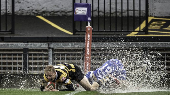 Newport demonstrated to Bridgend just how potent their defence has become recently as, following a poor clearance kick, the Ravens set about attacking the Black and Ambers. Newport patiently made their tackles until the opportunity came to isolate the ball-carrier, flood the tackle area, march over the ball en masse, and invite the Bridgend backrow to try and enter the ruck from an offside position and, hey presto! There’s your penalty. Matt O’Brien booted to the corner while Kyle Tayler was hoisted high at the front of the lineout. Newport began battering away at the blue and white-shirted defence, Geraint Watkin popping the ball up to a series of willing runners. Josh Skinner made good ground but the defence was resistant. It took a moment of Matt O’Brien inspiration to unpick the lock; with seemingly a two-on-three situation ahead of him, O’Brien placed a delicate kick using the outside of his foot to set up a race between Jonny Morris and Bridgend’s Dewi Cross. It looked like a tight race but Morris won it, touching down to score Newport’s second try. The conversion went wide making the score Newport 10 Bridgend 0 on ten minutes.
