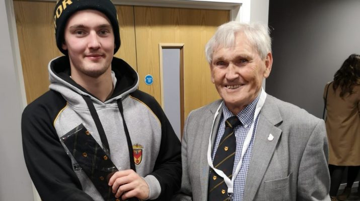 Harri Lang missed the end of season dinner back in May as he was on holiday, so after the win over Bridgend club ambassador Brian ‘BJ’ Jones presented him with his club tie to recognise 20 appearances in Black & Amber.